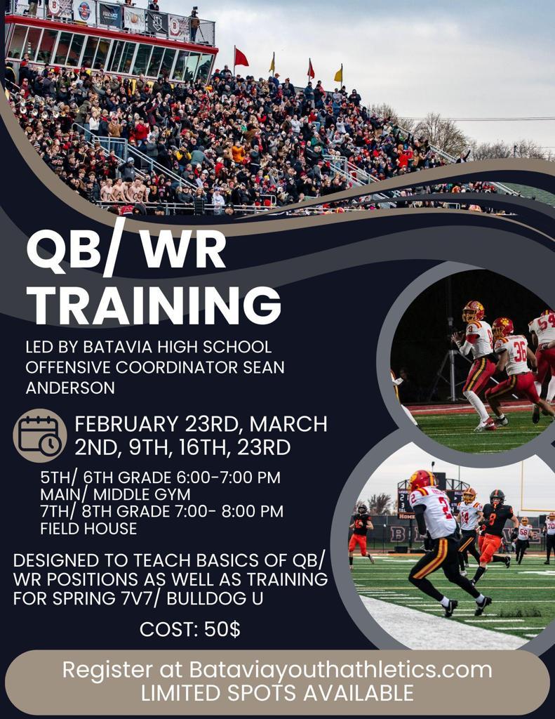 Designed to teach basics of QB/WR positions as well as training for Spring Bulldog U/7on 7. Led by Batavia High School Offensive Coordinator, Sean Anderson.